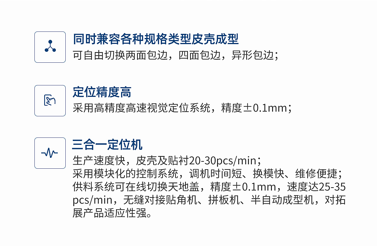TG-PF20C型全智能皮殼成型機(jī)是我司研發(fā)的通用多功能皮殼成型設(shè)備,能適應(yīng)單片、多片、異型和圍條的成型。同時兼容各種規(guī)格類型皮殼成型,可自由切換;獨(dú)立工位掐角成型質(zhì)量好。