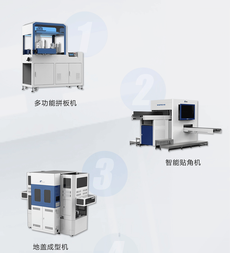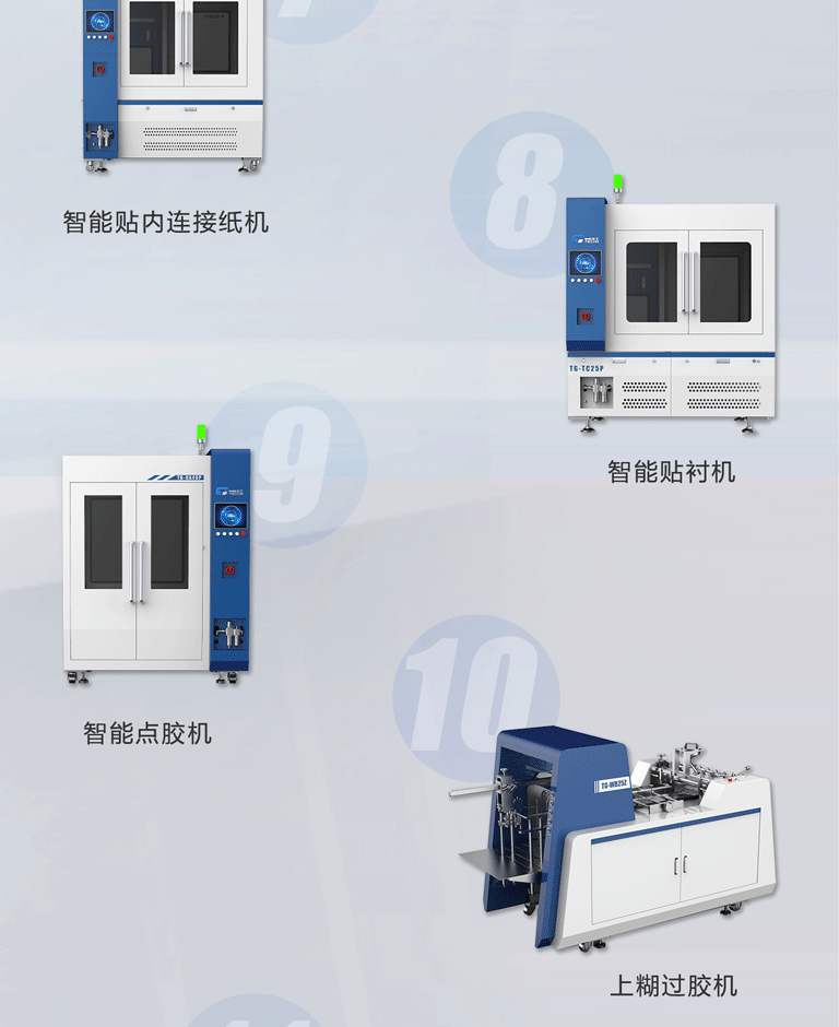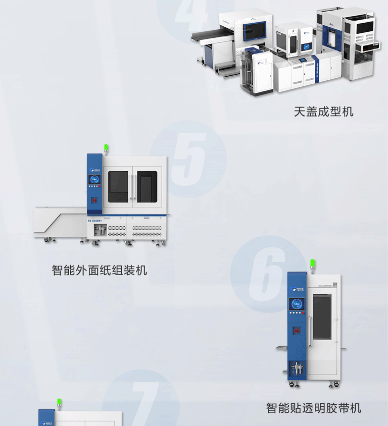 該數(shù)字化產(chǎn)線完整的解決了灰板成型、天地蓋成型、圍框成型、天地蓋組裝、自動貼襯、自動貼連接紙、自動噴膠組裝等全套工藝;采用模塊化設(shè)計,分段式控制,數(shù)字化調(diào)節(jié),操作簡單,人力極大精實。是我司針對箱式酒盒類產(chǎn)品專項開發(fā)的多功能智能產(chǎn)線,擁有獨立的知識產(chǎn)權(quán)和完整的一站式實施解決方案。