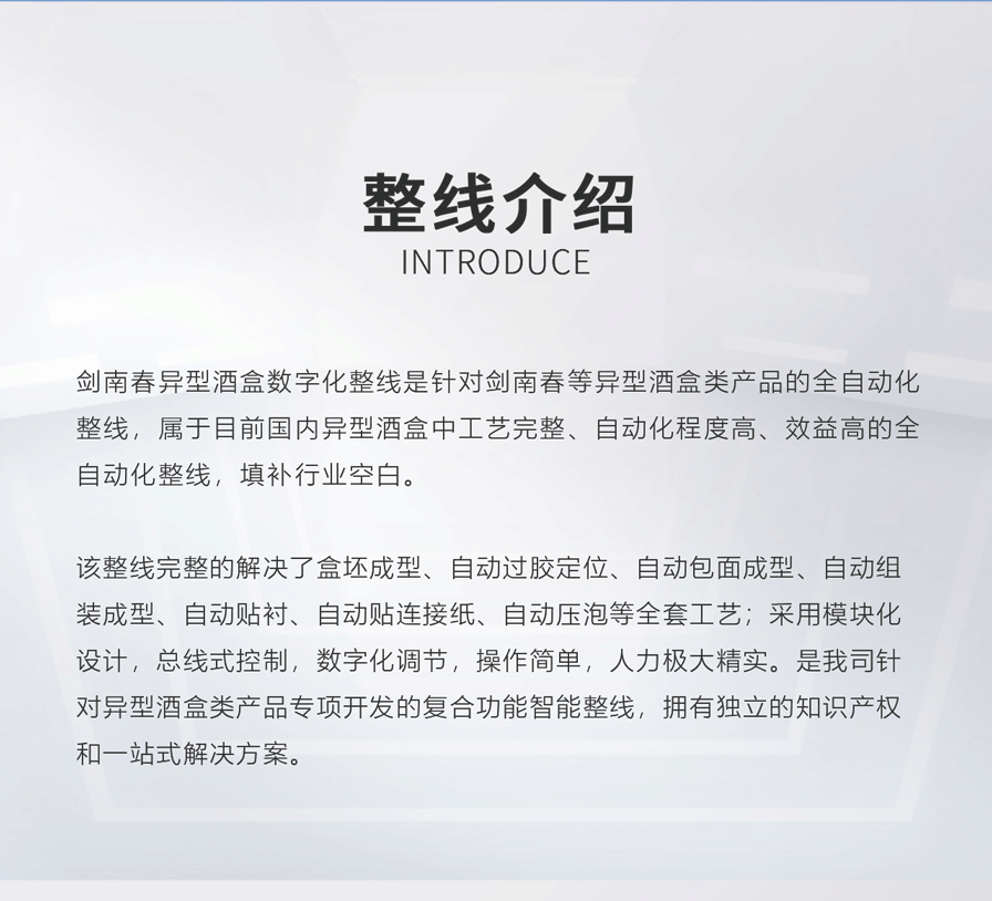 劍南春異型酒盒數字化整線是針對劍南春等異型酒盒類產品的全自動化整線,屬于目前國內異型酒 盒中工藝完整、自動化程度高、效益高的全自動化整線,填補行業(yè)空白。